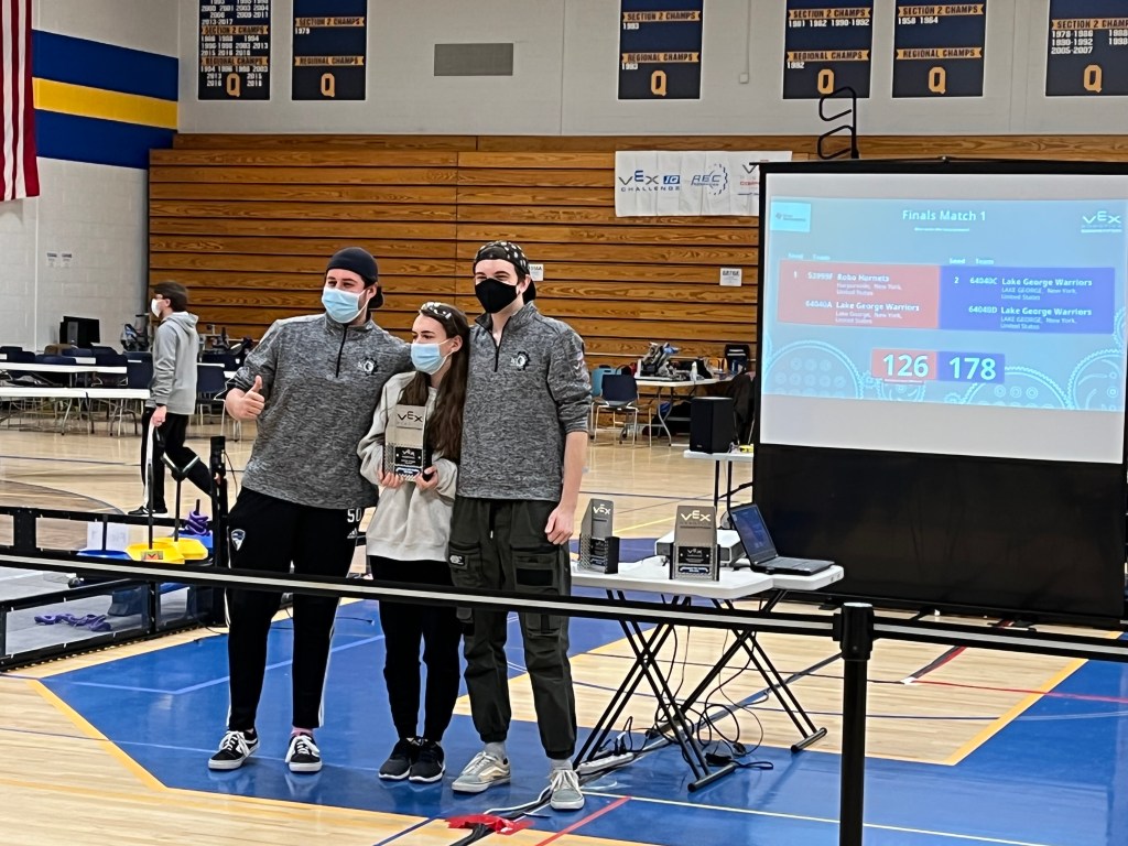 Congratulations to our entire Lake George VEX Robotics team for a successful day at the tournament hosted at Queensbury High School. Lake George robots 64040-C and 64040-D teamed-up to finish in first place today. Lake George robot 64040-A teamed-up with Harpursville to finish in second place. Lake George robot 64040-B finished in the quarterfinals. Lake George technology education teacher Mr. Stroebel is the team’s faculty advisor and mentor.