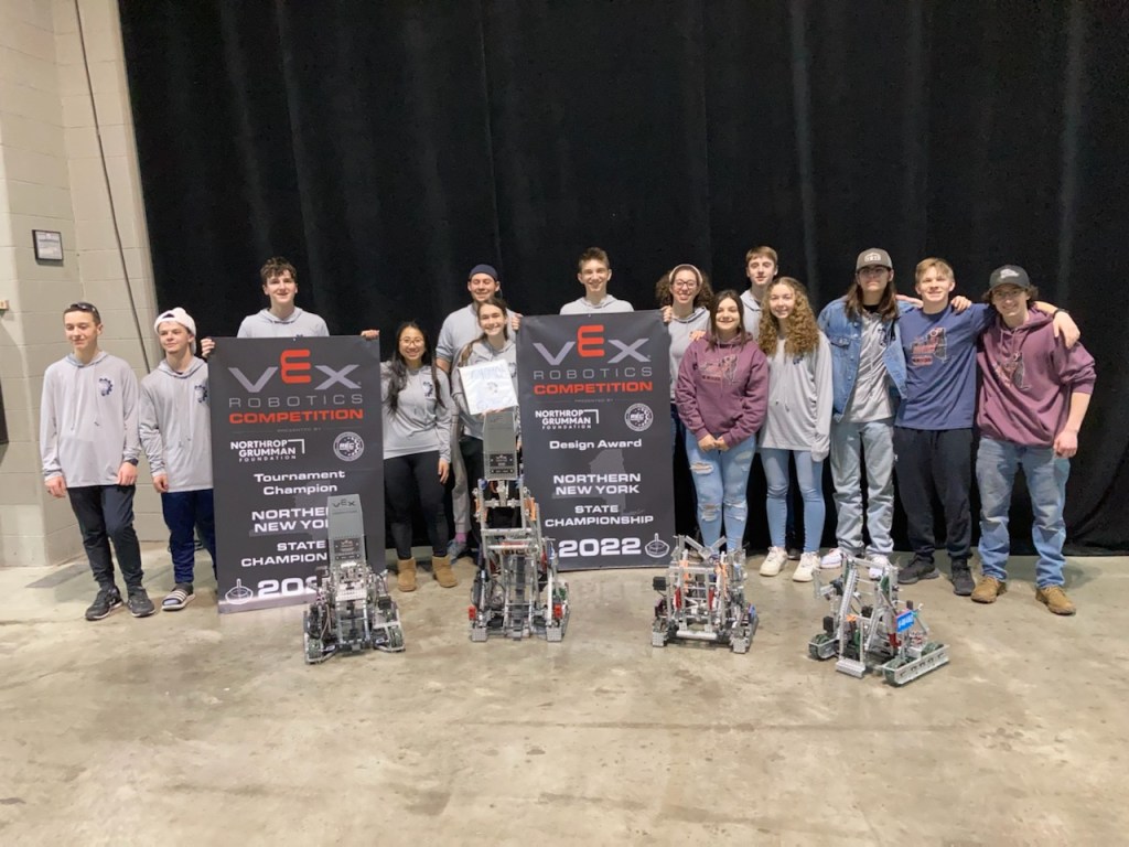 Congratulations to the Lake George VEX Robotics Team for becoming the Tournament Champion at the Northern New York State Championship competition held today in Syracuse, New York. The team was also awarded the prestigious Design Award for one of its robots. These tremendous accomplishments have earned the team a trip to Dallas, Texas, in early May to compete in the VEX Robotics World Championship. Lake George technology education teacher Mr. Stroebel is the team’s faculty advisor and mentor.