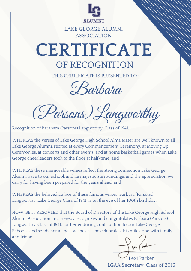 On behalf of the Lake George Alumni Association, we would like to extend our heartfelt congratulations and well wishes as Barbara celebrates this incredible milestone and recognition with her family and friends!